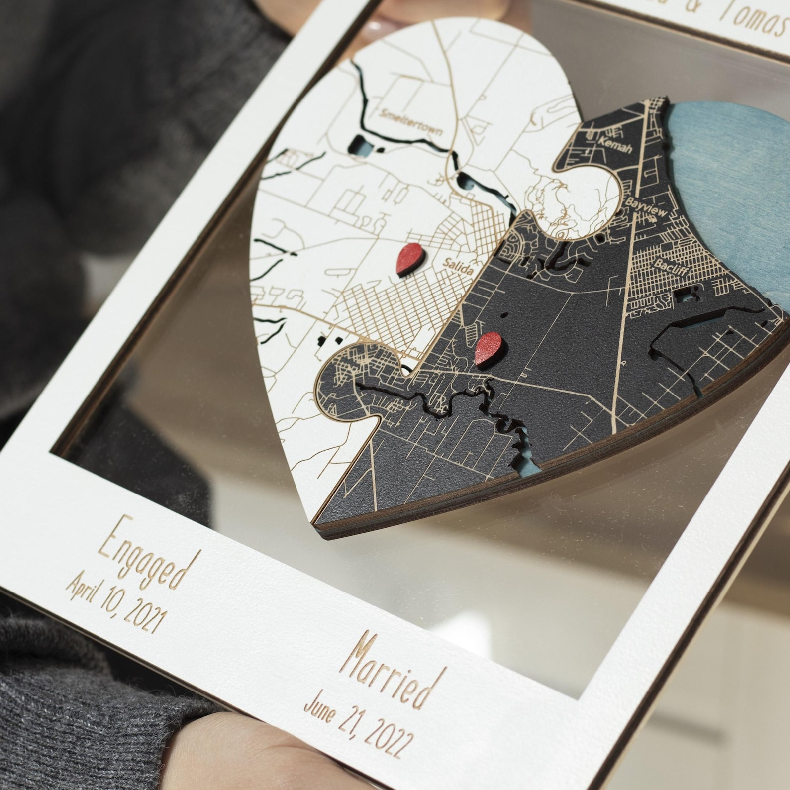 Two puzzle-shaped wooden maps are laser-cut and layered to form a single framed artwork that symbolizes your connection. Provide two locations (addresses or coordinates) and we’ll create a beautiful, detailed map with your chosen personalization.