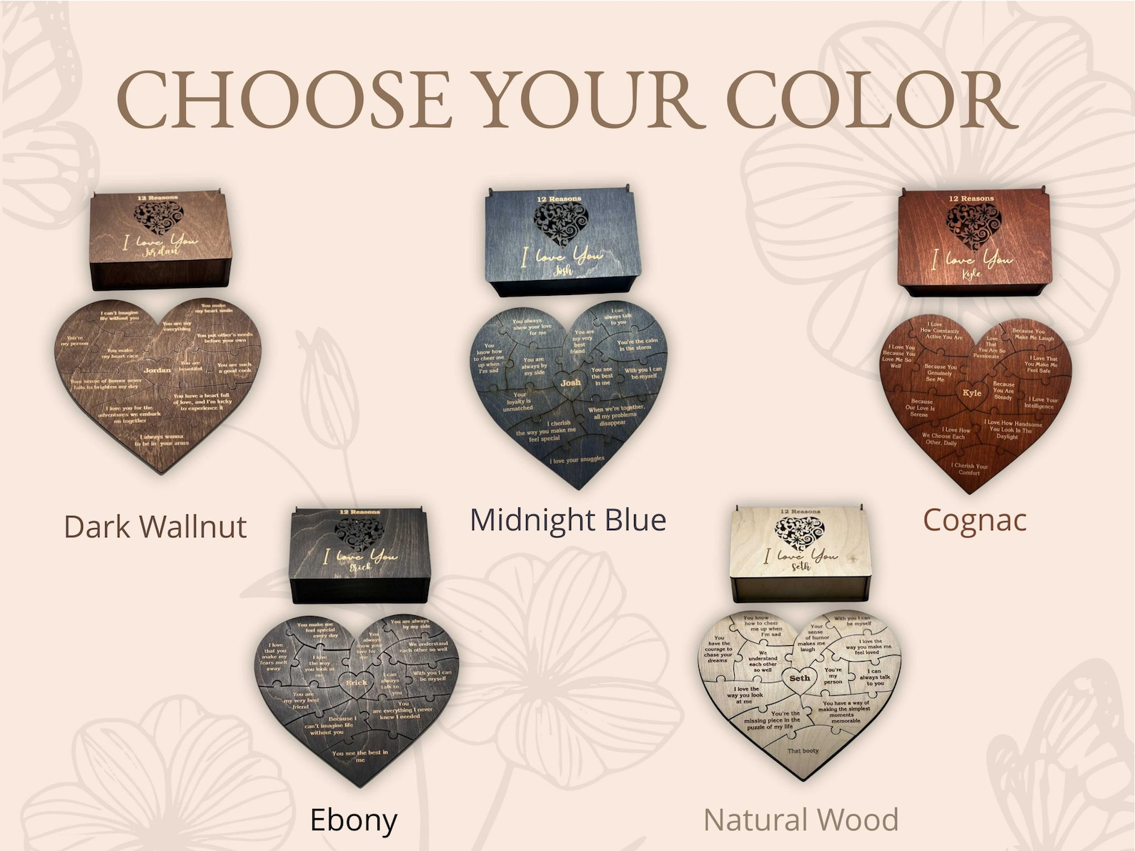 Inside the wooden box, each puzzle piece is engraved with a unique reason why you love your partner.