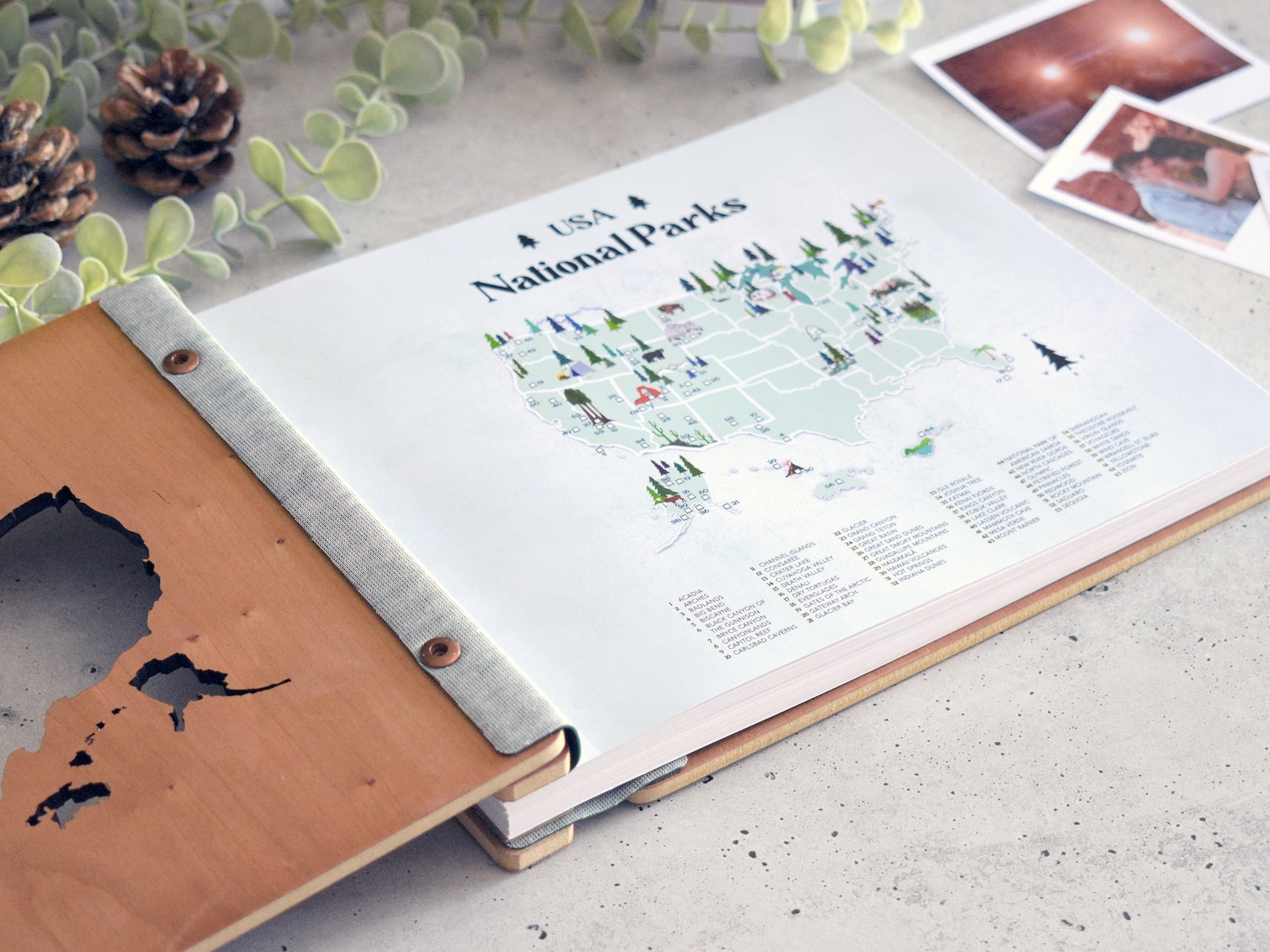 Discover the beauty of America’s national parks with our USA National Parks Adventure Book — a beautifully crafted wooden travel map book designed for adventurers, hikers, campers, and nature lovers. Featuring an engraved wooden cover with a detailed USA national parks map, this keepsake helps you capture, organize, and relive every outdoor adventure.